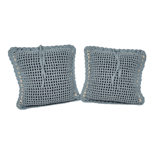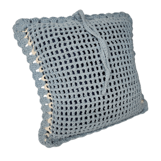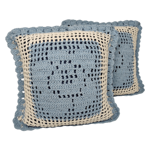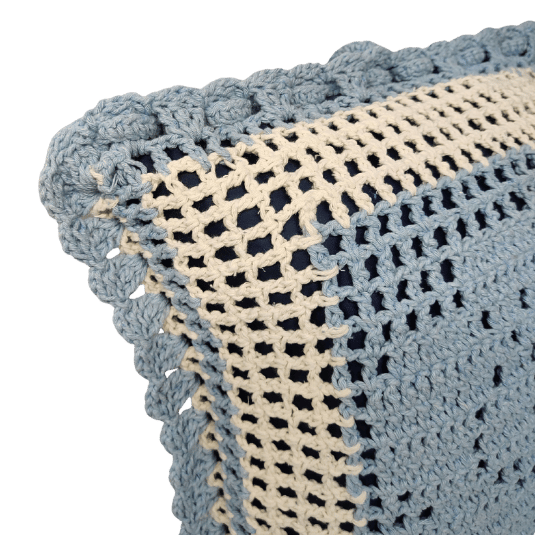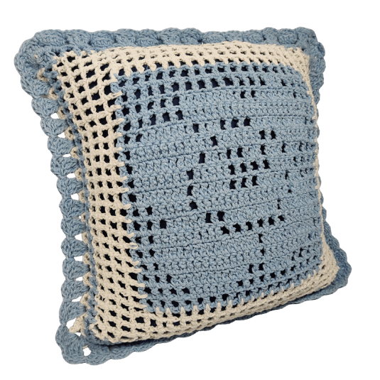 — Confeccionada em linha 85% algodão na cor Natural fio 6 e cor Azul claro fio 8. Almofada interna de Cetim.