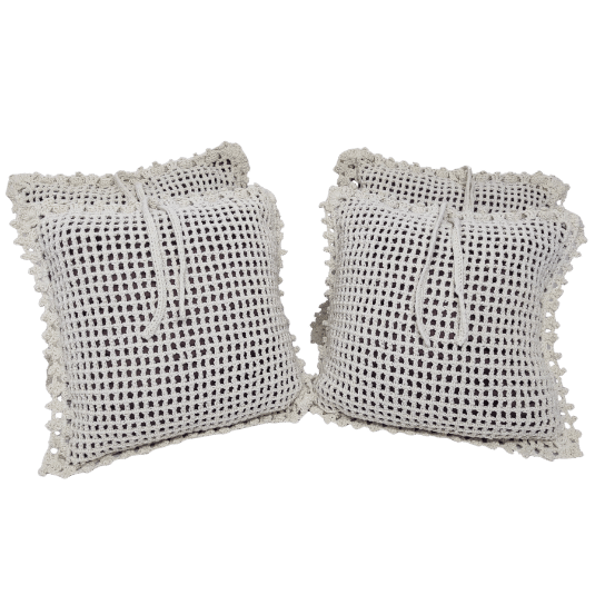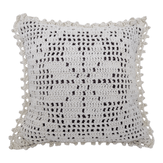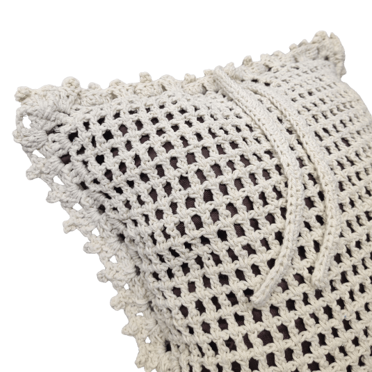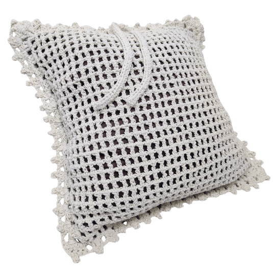— Confeccionada em linha 85% algodão na cor Natural fio 6. Almofada interna de Cetim.