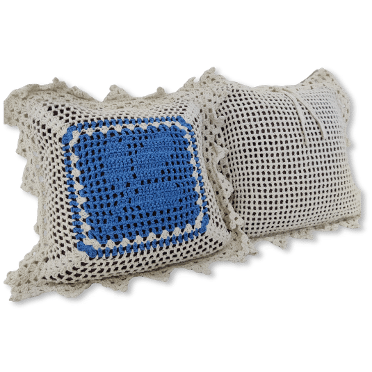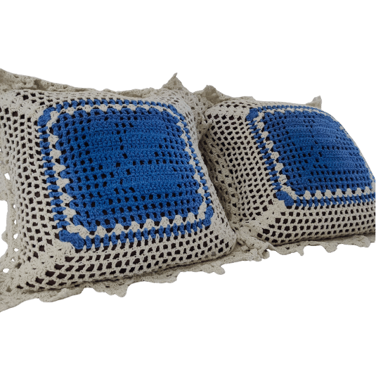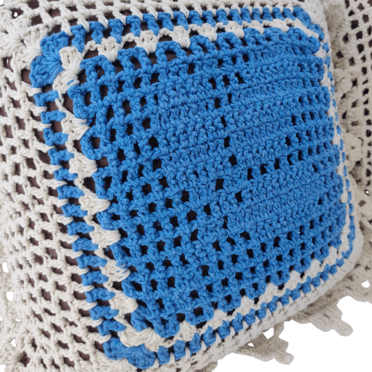 — Confeccionada em linha 85% algodão na cor Natural fio 4 e cor Azul Escuro fio 6. Almofada interna de Cetim.