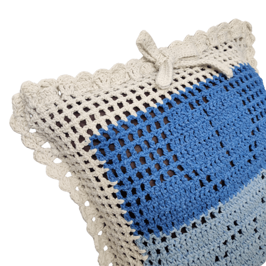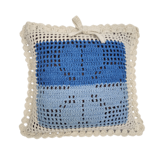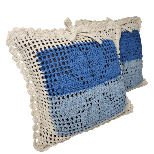 — Confeccionada em linha 85% algodão na cor Azul escuro e Natural fio 6. Cor Azul claro fio 8. Almofada interna de Cetim.