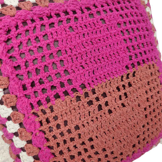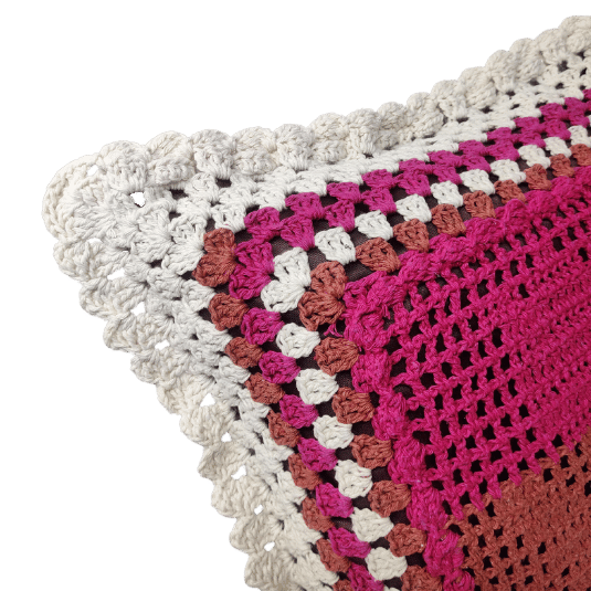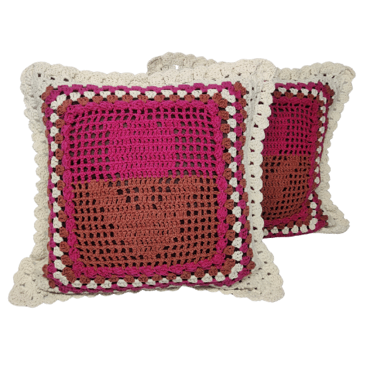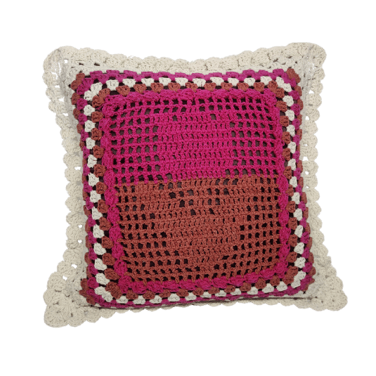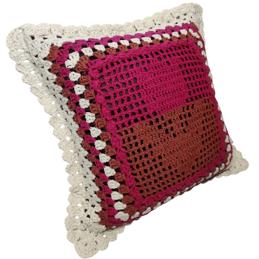 — Confeccionada em linha 85% algodão na cor Natural fio 6, cor Marrom claro e Pink fio 4. Almofada interna de Cetim.